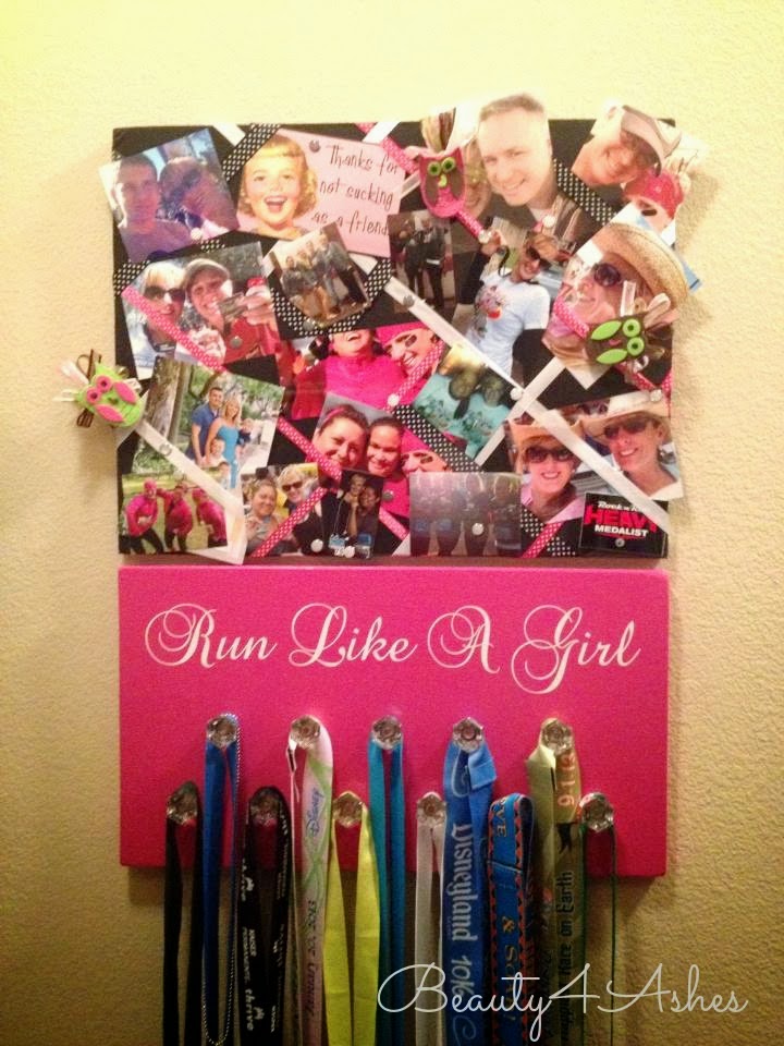 Today's art is a sign that a friend of mine asked me to make for her. She had seen the idea somewhere and wanted to have a sign that says "Run Like a Girl" with knobs to hang her medals from her runs. My friend ordered the vinyl for the quote from someone on Etsy and found the knobs at Walmart.com.